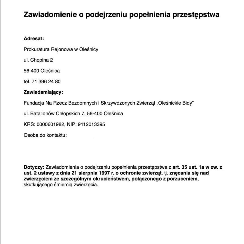 4 KWIETNIA ŚWIATOWY DZIEŃ BEZDOMNYCH ZWIERZĄT ❤️🩹❤️🩹❤️🩹” Jest tylu wśród was.Twa fascynacja mną prysnęła jak czar.Wywiozłeś mnie daleko gdzieśBo przeszkadzała Ci moja sierść.Na pożegnanie dostałem pięścią w nos.Skazałeś mnie na okrutny losNa głód i chłódNa bezlitosne pcheł kąsanieNie na szybką śmierćLecz na powolne w mękach konanie.Biegałem w amoku – łapy zdarłem do krwi.Nie odnalazłem powrotu – który mi się śni.Mój przyjacielu – czym dla Ciebie jest pies?Odpowiedź jest prostaPies to nie istota – to zbędna, niepotrzebna rzecz.Pies – to tylko pies – bez serca, uczuć i łez.Czy źle Ci służyłem? – wiedz, że wszystko znosiłem– Pragnienie i głód.– Ataki Twej złości.– Przenikliwy ból.– Rozpaczliwą samotność długich dni.Nie byłem wcale głaskanyTeraz to wiem – byłem po prostu niechciany.Człowieku! – obojętnie, kim jesteś i jaki masz w życiu celWiedz – los mści się, czy tego chcesz, czy nie.I Ci których kochasz, poświęciłeś im tyle lat,Wierni zasadom coś wpajał im od latpo drabinie z bielutkich obłoków do tęczowej, świetlistej bramy? …Uchylona, choć nie słychać Twych kroków.Nie znając szacunku, pójdą w Twój śladZabiorą Ci godność, wywiozą gdzieś w świat.Wywiozą Cię do przytuliska dla ludzi,Ludzi niechcianychNie wiem czy będziesz tam dobrze traktowanySzacunek w świecie ludzi jest mało znanyLecz wiem co czuł będzieszTo co ja teraz czuję – tęsknotę i niezapomniany zapachZapach, którym pachnie utracony dom.I płakał będziesz, aż braknie Ci łez.Uwierz! – mówi Ci to Twój pies.Sam sobie kiedyś zadasz pytanieZa co? – tak podłe traktowanieZa miłość, wierność i oddanieW zamian jest właśnie takie traktowanie.Nagle – jak we mgle widzę, coś o twarzy człowiekaRozchyla trawę – patrzy, nie dowierza – czy to jest pies?Mówi – piesku, kto ci to zrobił serce ma z kamienia.Nie – to nie złudzenie z wycieńczenia,To przyszła śmierć z twarzą człowieka – stoi i czeka.Wśród szumu drzew i wysokich traw,Wydaję moje ostatnie tchnienie.Człowieku! – przyjacielu ślę Ci przebaczenie.Twój pies.I tak z braku szacunku i z ludzkiej głupotyW ponurym lesie, wśród wysokich trawTo nie jedyne – ostatnie tchnieniePsów wyrzucanych od lat.” 🐾🐾🐾ZAWSZE MOŻESZ POMÓC ODDAJĄC SWÓJ 1,5%KRS 0000601982 ❤️Zbiórka 👇👇👇https://www.ratujemyzwierzaki.pl/jubileuszowaobietnica