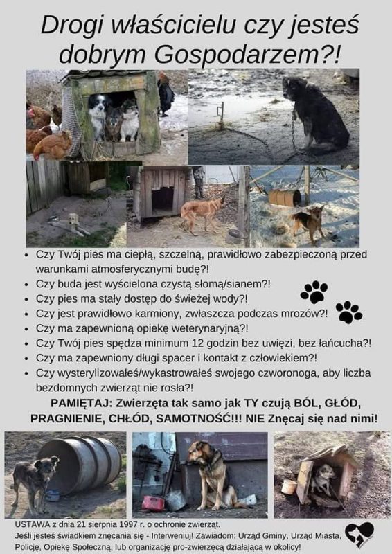 3. Zawiadamiaj odpowiednie służby (Policja, Straż Gminna/Miejska, Inspektorat Weterynarii) w przypadku zaniedbań lub znęcania się.